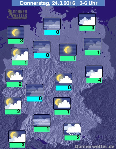 In der Nacht zum Donnerstag fällt im Stau der Alpen und am Erzgebirge unter dichten Wolken zeitweise Regen, Schneeregen oder Schnee, sonst ist es im Süden und Osten oft wechselnd oder stark bewölkt, jedoch weitgehend trocken. Weiter nach Norden und Westen hin zeigt sich der Himmel verbreitet sternenklar oder es ziehen nur lockere Wolken durch, dazu bleibt es trocken. Die Temperatur sinkt auf 4 Grad in Dresden und bis 0 Grad am Westerwald.
