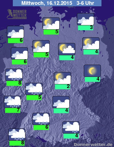 In der Nacht zum Mittwoch breitet sich der Regen auf weite Teile von West-, Südwest- und Süddeutschland aus, dabei fällt auch teils langanhaltender Regen. Über Sachsen und Sachsen-Anhalt zeigt sich der Himmel hingegen meist nur locker bewölkt oder sternenklar, im Rest der Republik ist es meist stark und hier und da aufgelockert bewölkt, dabei bleibt es trocken. Die Temperatur sinkt auf 8 Grad in Aachen und bis 2 Grad am Frankenwald.