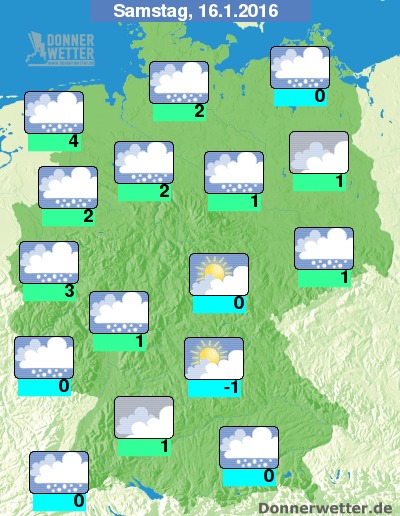Heute fällt an den Alpen weiterhin zeitweise Schnee, über der Nordhälfte des Landes ist es verbreitet stark bewölkt, jedoch anfangs noch meist trocken, sonst ist es zunächst teils stark, teils aufgelockert bewölkt und dabei trocken. Im Tagesverlauf ziehen im Westen und Norden zum Teil kräftige Schneefälle auf, vor allem im Westen ist auch vorübergehend teils Schneeregen oder Regen möglich, dabei besteht verbreitet erhöhte Glättegefahr! Gegen Abend zieht es sich auch in den übrigen Landesteilen mehr und mehr zu, jedoch fällt hier nur gebietsweise etwas Schnee. Die Temperatur steigt auf -2 Grad im Allgäu und bis 4 Grad im Rheinland.