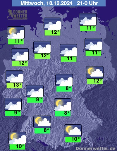 In der Nacht zum Donnerstag zeigt sich der Himmel meist stark bewölkt, größere Auflockerungen gibt es vor allem südlich der Donau. Es bleibt zunächst häufig trocken, im Nachtverlauf zieht von Westen her Regen auf, der nachfolgend auf die gesamte Nordwesthälfte übergreift.