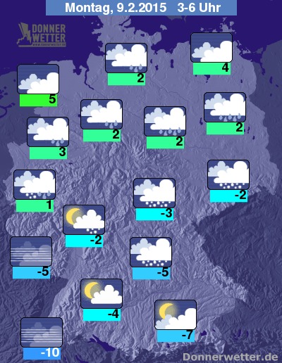 In der folgenden Nacht ist es in der Südhälfte des Landes bei meist aufgelockerter oder auch nur leichter Bewölkung zunächst trocken. Von Norden her ziehen jedoch dichte Wolken auf, dazu fällt zeitweise Regen, Schneeregen oder Schnee. Nach Mitternacht ziehen die dichten Wolken mit Schneefällen auch in den Süden der Republik. Es muss verbreitet mit Straßenglätte gerechnet werden! Die Tiefstwerte liegen bei 5 Grad in Oldenburg und bis -10 Grad am Rande des Schwarzwalds. Im Norden und Osten, später auch im Südosten weht ein teils starker, in Böen auch stürmischer Wind.