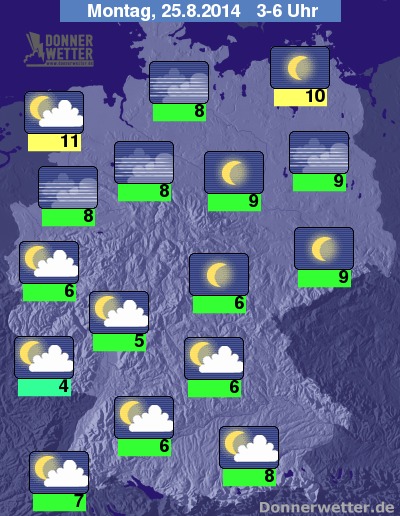 In der kommenden Nacht ist besonders von der Mitte Deutschlands bis in den Osten und Nordosten ein vielfach klarer Sternenhimmel zu beobachten, dichtere Wolken halten sich im Süden und Südwesten des Landes, dabei bleibt es trocken, sonst ist es meist locker oder aufgelockert, örtlich auch klar und ebenfalls trocken. Die Temperatur sinkt auf 11 Grad an der Nordsee und sehr frische 4 Grad im Bliesgau.