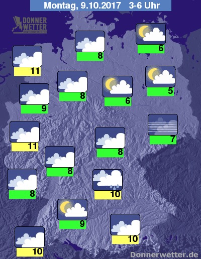 In der bevorstehenden Nacht kann es im Süden unter dichten Wolken hier und da etwas regnen, auch sonst bleibt es verbreitet stark bewölkt, jedoch weitgehend trocken. Meist nur locker bewölkt oder sogar sternenklar zeigt sich der Himmel von Sachsen bis zur Ostsee, hier bleibt es komplett trocken. Die Temperatur sinkt auf 11 Grad in Cuxhaven und bis 5 Grad im südlichen Brandenburg.