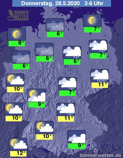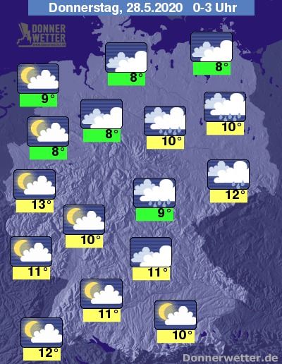 Bis zu den Frühstunden kühlt die Luft auf 12 bis 6 Grad ab, im Südwesten halten sich die Temperaturen meist im zweistelligen Bereich auf.