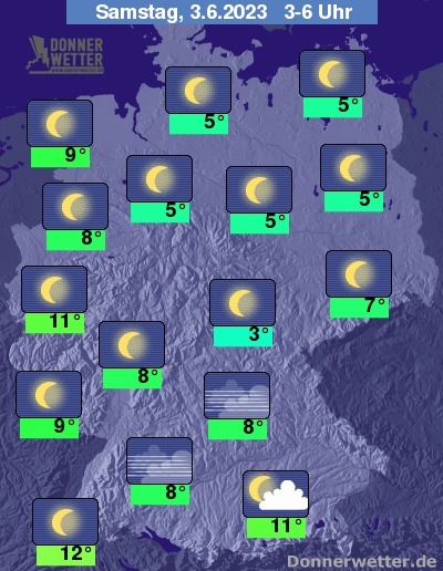 In der kommenden Nacht zeigt sich der Himmel verbreitet sternenklar. Nur regional sind auch mal ein paar lockere Wolken möglich. Bei Tiefstwerten von 12 Grad in Freiburg und bis 3 Grad in Jena bleibt es landesweit trocken.