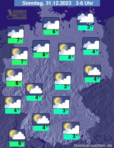 In der Nacht zum Sonntag ist es aufgelockert, vor allem am Morgen überwiegend stark bis dicht bewölkt, dazu bleibt es bis auf seltene Tropfen trocken. Die Temperatur sinkt auf 8 Grad in Köln und bis 3 Grad in Nürnberg. Nach Westen und Nordwesten hin weht ein zunehmend frischer bis starker Wind.