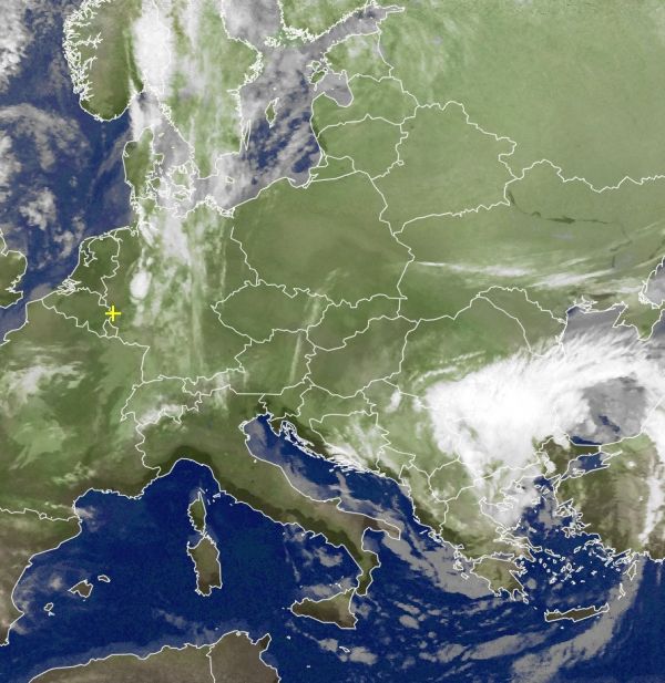 Das Satellitenbild zeigt dichte Wolken über Deutschland. Ein ausgeprägter Tiefdruckwirbel bestimmt das Wetter über dem östlichen Mittelmeerraum.
