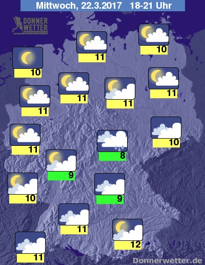 Gegen Abend breitet sich leichter Regen von Süddeutschland über die Mitte Richtung Norden aus. Von der Eifel bis nach Brandenburg kann es zu Tagesbeginn gebietsweise leichten Frost geben. Die Höchsttemperaturen erreichen 7 bis 11 Grad. Bei längerem Sonnenschein kann das Quecksilber auch auf 15 Grad klettern. Der Wind ist meist nur schwach bis mäßig.