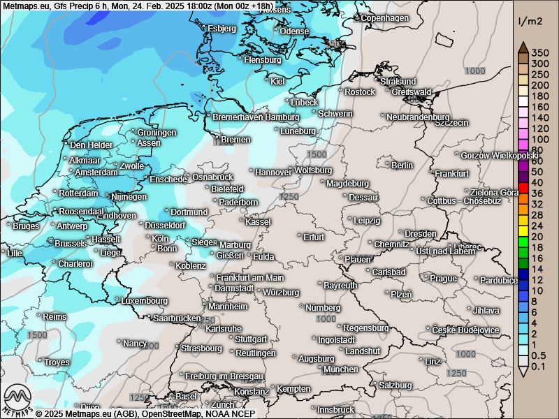 Regenmengen im Westen und Nordwesten zwischen 3-5 l/m2 nach GFS.
