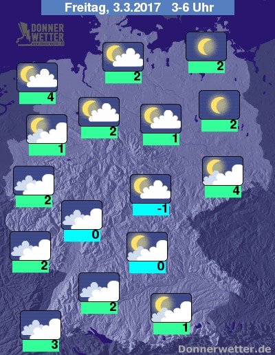 Die Höchstwerte liegen am frühen Abend zwischen 5 Grad im Thüringer Bergland und 9 Grad an Rhein und Donau.