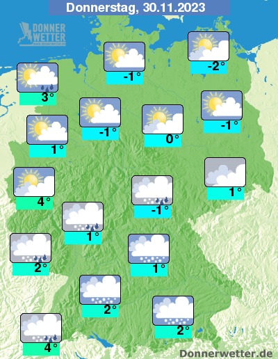 Am Donnerstag zeigt sich der Himmel über weiten Teilen der Nord- Westhälfte heiter bis wolkig oder es ist aufgelockert bewölkt; dabei muss nur selten mit Niederschlägen gerechnet werden, am ehesten im Küstenumfeld. Im Süden und Südwesten fallen heute bei meist starker Bewölkung immer wieder Niederschläge, im Südwesten meist als Regen oder Schneeregen, sonst als Schnee. Es besteht erhöhte Glättegefahr!
