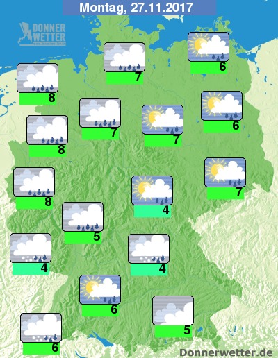 Mit stark auffrischendem Südwestwind zieht ein Regengebiet von der Nordsee ins Land herein. Die Schneefallgrenze steigt dabei vorübergehend bis in die Gipfellagen der Mittelgebirge an. Im Tagesverlauf erreicht der Regen auch das nördliche Baden-Württemberg und Bayern. Mit Temperaturen zwischen 2 und 9 Grad wird es oft unangenehm nass-kalt. Die höheren Werte findet man im Nordwesten, sowie auf den Nordseeinseln.