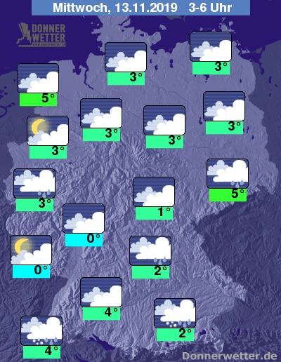 In der Nacht zeigt sich der Himmel in der Nordhälfte zunächst noch häufig locker oder aufgelockert bewölkt, bevor die Bewölkung im Nachtverlauf zunimmt. In der Südhälfte des Landes bleibt der Himmel über die gesamte Nacht stark bewölkt oder bedeckt. Es bleibt überwiegend trocken, nur südlich des Mains sowie im äußersten Südosten muss zeitweise mit Schauern gerechnet werden. Im Schwarzwald sowie in Oberbayern fallen die Niederschläge auch als Schneeregen oder Schnee. Örtlich besteht Glättgefahr!