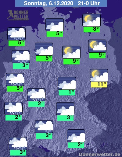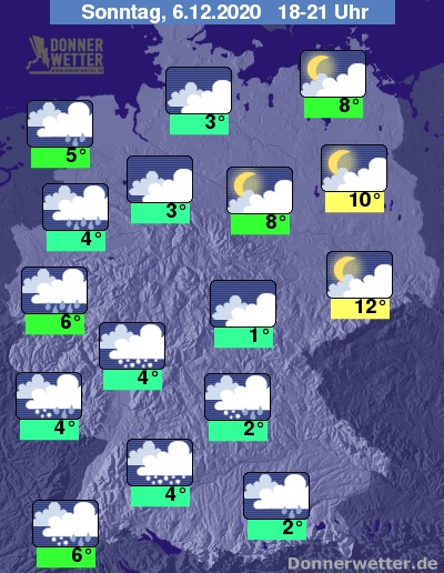 In den Abendstunden bleibt der Himmel über weiten Landesteilen bedeckt, Auflockerungen beschränken sich meist auf den äußersten Osten Deutschlands. Hier bleibt es bei sehr milden 8 bis 12 Grad auch meist trocken. Niederschläge, die in höheren Lagen auch als Schneeregen oder Schnee fallen, sind am Abend ím Süden und Westen zu erwarten. Hier erreicht das Thermometer Werte meist um 2 bis 6 Grad.