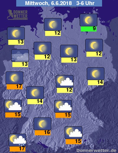 In der bevorstehenden Nacht sind einzig im Breisgau noch hier und da einzelne Schauer und Gewitter möglich, im übrigen Land zeigt sich der Himmel hingegen verbreitet sternenklar, vor allem im Süden auch teils locker bewölkt. Es bleibt trocken bei Tiefstwerten von 17 Grad in Freiburg und etwa 9 Grad in Neubrandenburg.