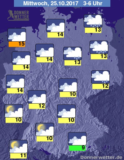 In der folgenden Nacht fällt unter dichten Wolken vor allem im Norden und Osten immer wieder Regen, sonst bleibt es weitgehend trocken. Im Südwesten ist der Himmel auch oft aufgelockert bewölkt. Die Temperatur sinkt auf 15 Grad in Emden und bis 9 Grad in Rosenheim.