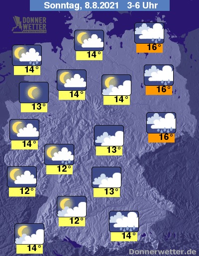 In der folgenden Nacht halten sich allem über der Osthälfte noch meist kompakte Wolken, die zum Teil kräftigen und gewittrigen Schauer ziehen im Nachtverlauf mehr und mehr nach Osten hin ab. Weiter nach Westen hin ist der Himmel oft nur locker oder aufgelockert bewölkt, hier bleibt es auch größtenteils trocken. Die Temperatur sinkt auf 16 Grad an der Oder und bis 12 Grad am Mittelrhein.