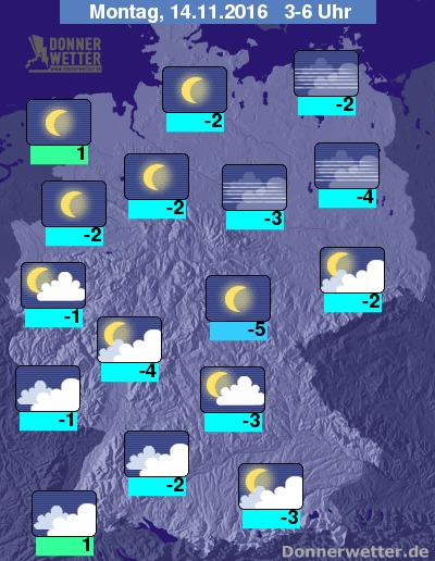 In der kommenden Nacht ist der Himmel über der Nordosthälfte Deutschlands verbreitet sternenklar, hier und da kann sich Nebel oder Hochnebel bilden. Weiter nach Südwesten hin werden die Wolken allerdings immer dichter, trotzdem bleibt es auch hier komplett trocken. Die Temperatur sinkt auf 1 Grad in Emden und bis auf -5 Grad im Grabfeld.