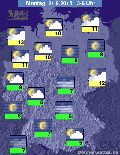 In der Nacht zum Montag zeigt sich der Himmel über der Südhälfte des Landes, sowie im Osten verbreitet sternenklar. Zeitweise dichte Wolken sind insbesonders im Nordwesten Deutschlands möglich, dabei ist aber nur gelegentlich auch etwas Regen möglich. In den übrigen Landesteilen zieht zumeist lockere, teils auch aufgelockerte Bewölkung durch und es bleibt trocken. Die Temperatur sinkt auf 13 Grad in Ostfriesland und bis 5 Grad in Münchner Umland. Stellenweise bildet sich Nebel oder Dunst.