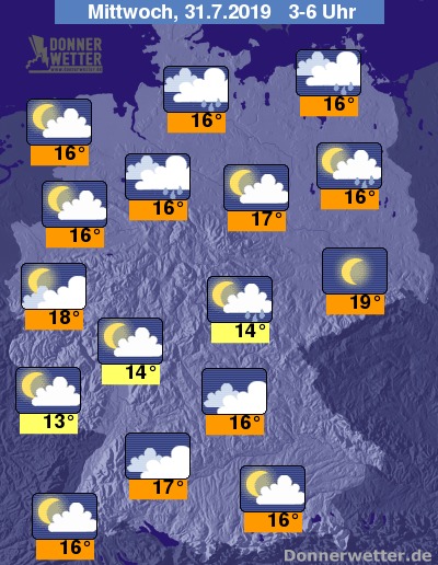 In der kommenden Nacht zeigt sich der Himmel meist locker bewölkt mit einzelnen Schauern. Im Norden hingegen begleitet die Nacht meist ein bedeckter Himmel mit verhäuften Schauern. Die Temperaturen fallen auf 16 Grad an der Ostseeküste und 13 Grad ums Saarland.
