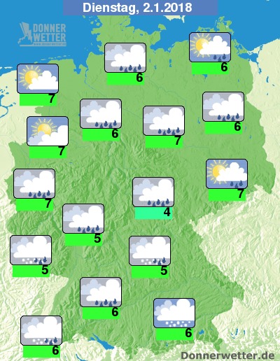 Am Dienstag kann es im Nordwesten vorübergehend mal aufheitern, sonst überwiegen jedoch dichte Wolken das Wettergeschehen und es fällt zeitweise Regen, im Süden und Südosten auch Schneeregen oder Schnee. Die Temperatur erreicht nasskalte 4 bis 7 Grad.