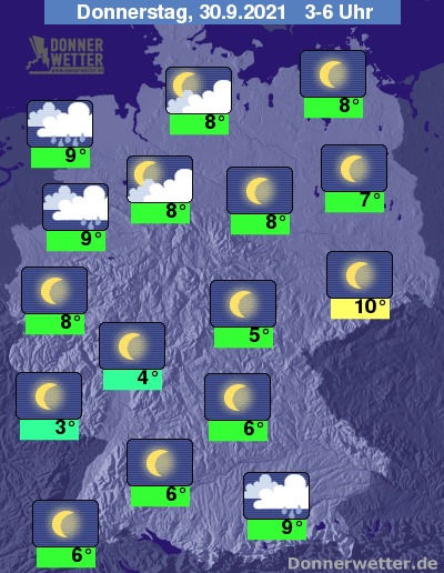 In der Nacht zum Donnerstag halten sich im südlichen Bayern, sowie im Nordseeumfeld dichte Wolken aus denen es zeitweise regnet. Im übrigen Bundesgebiet zeigt sich der Himmel hingegen weitgehend sternenklar und es bleibt trocken. Die Temperatur sinkt auf 10 Grad in der Lausitz und etwa 3 Grad im Saargau.
