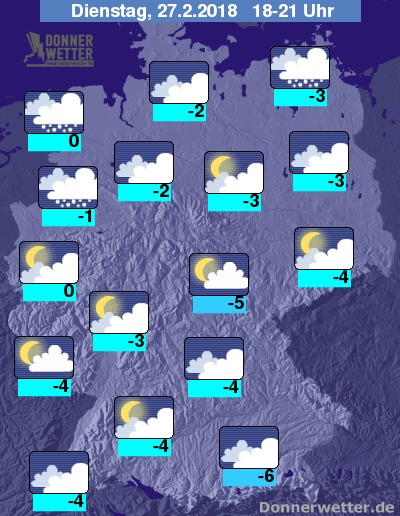 In der Nacht zum Mittwoch klart der Himmel vor allem im Süden weitgehend auf, sonst wird es oft gering bis wechselnd wolkig und dazu trocken. Dichtere Wolken halten sich im Umfeld von Nord- und Ostsee, hier sind auch weitere Schneefälle möglich. Die Temperatur sinkt auf -5 Grad in Düsseldorf und bis auf eisige -13 Grad in Rosenheim.