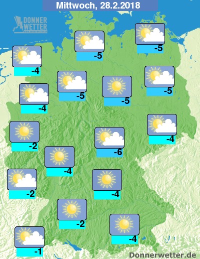 Am Mittwoch zeigt sich das Wetter über dem Land verbreitet heiter ode sonnig und es bleibt trocken. Einzig im äußersten Norden sind auch dichte Wolken und etwas Schnee möglich. Die Temperatur steigt auf -6 Grad im Eichsfeld und bis -1 Grad im Breisgau.