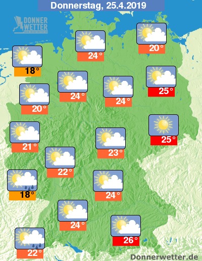 Der Donnerstag zeigt sich teils heiter teils sonnig. Niederschläge sind meist nur im Schwarzwald und ums Saarland zu erwarten. Die Temperaturen klettern auf 26 Grad um Oberbayern und 18 Grad im Ostfriesland.