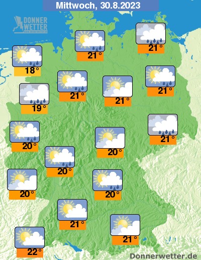 In der Nacht zum Mittwoch fällt im Osten aus dichten Wolken noch zeitweise Regen, der erst gegen Morgen abklingt bzw. nach Polen hin abzieht. Im übrigen Land ist es teils leicht bis aufgelockert, teilweise aber auch stark bewölkt, jedoch weitgehend trocken. Die Temperatur sinkt auf 13 Grad in Berlin und 9 Grad in München.