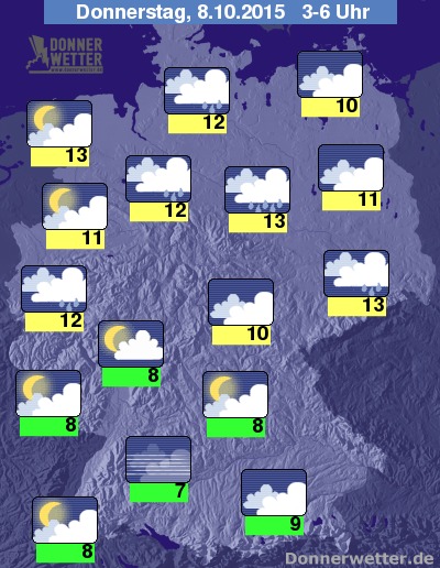In der Nacht zum Donnerstag ist der Himmel im Süden des Landes teils aufgelockert, teils aber auch stark bewölkt, dazu fällt hier nur selten etwas Regen. Von der breiten Mitte bis nach Norddeutschland ist es dagegen überwiegend bedeckt und von Schleswig-Holstein bis nach Sachsen hinein fällt zeitweise und zum Teil auch langanhaltender Regen. Sonst fällt nur hier und da etwas Regen und oft bleibt es auch trocken. Die Temperatur sinkt auf 13 Grad in Magdeburg und bis 7 Grad in Konstanz. Im Süden bildet sich stellenweise Nebel oder Hochnebel.