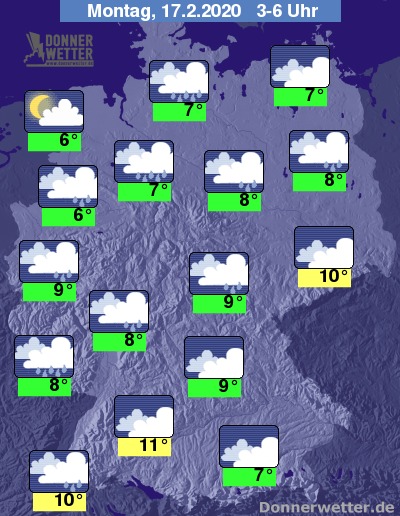 In der Nacht zum Montag ziehen die dichten Regenwolken im Westen und Norden des Landes immer weiter Richtung Südosten und erreichen zum Morgen hin auch die östlichsten Landesteile und Süddeutschland. Im Nordwesten klingen die Niederschäge nachfolgend wieder ab und es lockert auf. Die Temperatur sinkt auf 11 Grad in Stuttgart und bis 6 Grad an der Ems. Der Wind weht im Norden oft stark bis stürmisch, an der Nordsee herrscht weiterhin Sturm, zum Teil auch schwerer Sturm.
