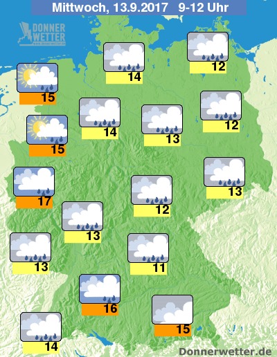 Am frühen Nachmittag nimmt die Niederschlagsintensität in den mittleren Landesteilen ab, teils kräftiger Regen fällt dann vor allem noch an den Küsten sowie im Südwesten. Die Sonne bleibt weiterhin auf Abstand, weiterhin muss vor allem im Norden mit Sturm- / Orkanböen gerechnet werden.