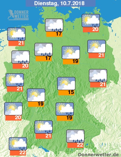 Am Dienstag zeigt sich das Wetter verbreitet unbeständig, bei wechselnder bis starker Bewölkung können sich wiederholt Schauer und lokal auch Gewitter entwickeln. Vom Saarland bis in die Mitte des Landes bleibt es jedoch auch vielerorts trocken. Die Temperatur steigt auf 15 Grad im Vogtland und bis 22 Grad im Oberrheingraben.