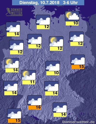 In der Nacht zum Dienstag ist der Himmel überwiegend stark, hier und da auch aufgelockert bewölkt, dazu bleibt es größtenteils trocken. Lediglich im Nordseeumfeld können sich gebietsweise Schauer und mögliche Gewitter bilden. Die Temperatur sinkt auf 16 Grad in Karlsruhe und bis 10 Grad im Eichsfeld.