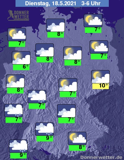 In der Nacht zum Dienstag ist der Himmel gebietsweise gering bis aufgelockert, vor allem im Süden jedoch meist stark bewölkt, hier bilden sich einzelne Schauer, während es sonst weitgehend trocken bleibt. Die Temperatur sinkt auf 10 Grad in Dresden und bis 6 Grad in Münster.