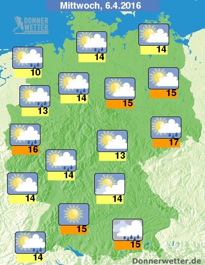 Heute halten sich im Alpenvorland zumeist dichte Wolken und es fällt gebietsweise Regen. Im übrigen Bundesgebiet ist es hingegen zunächst überwiegend heiter bis sonnig und dabei trocken. Am Nachmittag ziehen im Nordwesten jedoch dichte Wolken und zeitweiliger Regen auf, der sich bis zum Abend etwa auf die Nordwesthälfte der Republik hin ausbreitet. Die Temperatur steigt auf 10 Grad an der Nordsee und bis zu 17 Grad in Dresden.