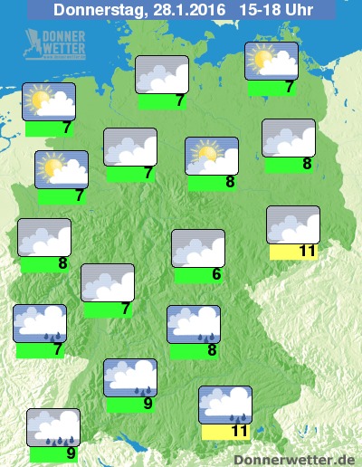 Heute Nachmittag heitert es im Nordwesten und Norden des Landes immer weiter auf, dazu bleibt es trocken. Dagegen halten sich über der Südhälfte weitgehend dichte Wolken aus denen immer wieder Regen fällt. Im übrigen Bundesgebiet bleibt es meist stark bewölkt, dabei jedoch trocken. Die Temperatur liegt bei 6 Grad im Vogtland und um 11 Grad im Raum München. Im Norden weht ein teils starker Wind.