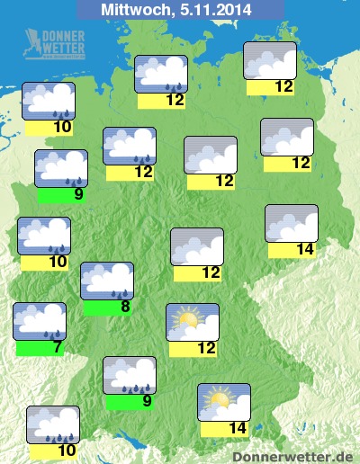Für den heutigen Mittwoch werden meist sehr viele und dichte Wolken vorhergesagt, die besten Chancen auf Sonne bieten sich noch im Südosten des Landes, sonst zeigen sich Auflockerungen aber nur selten. Dazu fällt besonders in der Westhälfte des Landes immer wieder Regen. Im Südwesten ist gebietsweise mit langanhaltendem und ergiebigem Regen zu rechnen. Nach Osten hin bleibt es dagegen weitgehend trocken. Die Temperatur steigt auf teils nur 7 Grad am Pfälzer Wald und bis etwa 14 Grad in München.