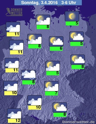 In der Nacht zum Sonntag bleibt es über der Osthälfte Deutschlands bei einer lockeren bis aufgelockerten Bewölkung trocken. Weiter nach Westen hin ziehen jedoch größtenteils dichte Wolken und im Westen ist dazu auch gebietsweise Regen möglich, sonst bleibt es weitgehend trocken. Die Temperatur sinkt auf 12 Grad in Freiburg und bis 5 Grad in Neubrandenburg.