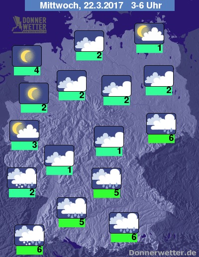 In der Nacht zum Mittwoch fällt im Süden und über Sachsen verbreitet, teils langanhaltender Regen. Im äußeren Westen, Nordwesten und Norden zeigt sich der Himmel meist sternenklar. Im übrigen Bundesgebiet ist es meist stark bewölkt, aber trocken. Die Temperatur sinkt auf 6 Grad in München und bis 1 Grad am Westerwald.