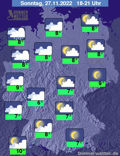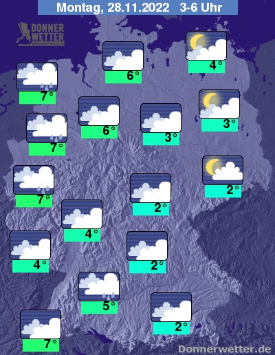 In der Nacht zum Montag zeigt sich der Himmel über den östlichen Landesteilen zunächst noch oft aufgelockert bewölkt, sonst ist es hingegen verbreitet dicht bewölkt und vom Niederrhein, über das westliche Niedersachsen bis nach Schleswig-Holstein fällt gebietsweise Regen. In den übrigen Landesteilen bleibt es weitgehend trocken bei Tiefstwerten von 7 Grad am Niederrhein bis 2 Grad in Mittelfranken.