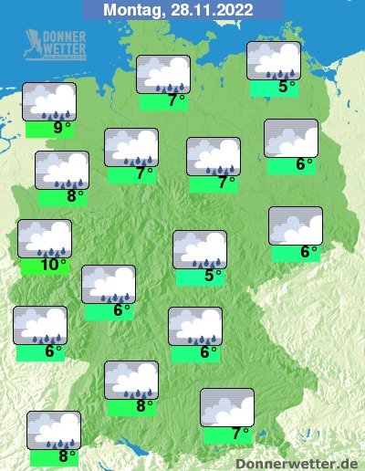 Am Montag ist es verbreitet stark bewölkt oder trüb, dabei bleibt es anfangs noch weitgehend trocken. Im Tagesverlauf zieht von Westen her jedoch Regen auf, der bis zum Abend über die Mitte bis in die östlichen Landesteile zieht. Ganz im Osten und Südosten bleibt es noch weitgehend trocken. Die Temperatur steigt auf 5 Grad in Neubrandenburg und bis 10 Grad in Köln.