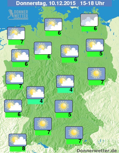 Heute Nachmittag ist es vor allem im Süden, aber auch im Osten von Deutschland häufig sonnig und trocken. Im übrigen Bundesgebiet zieht meist lockere bis aufgelockerte Bewölkung durch, gegen Abend ziehen sich die Wolken im Nordwesten zu, dazu kann im nördlichen Emsland und im Nordseeumfeld auch Regen fallen, sonst bleibt es aber trocken. Die Temperatur liegt bei 4 Grad im Vogtland und um 8 Grad im Breisgau.