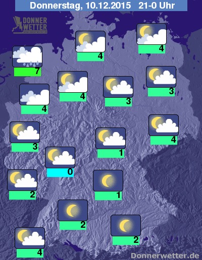 Heute Abend ziehen im Nordwesten dichte Wolken mit Regen auf, der sich bis Mitternacht auch auf den Norden und Westen des Landes ausbreitet. Vor allem im Süden ist es zunächst meist sternenklar, im übrigen Bundesgebiet zunächst meist locker, gegen Mitternacht noch meist aufgelockert bewölkt, dazu bleibt es aber trocken. Die Abendtemperatur liegt bei 7 Grad entlang der Nordseeküste und um 0 Grad am Taunus.