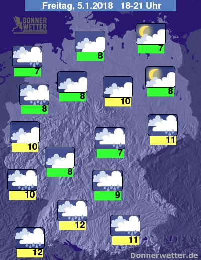 In der Nacht zum Samstag lockert es an der Nordsee zeitweise auf, sonst bleibt es jedoch bei weitgehend bedecktem Himmel und vor allem im Süden fällt zeitweise Regen. Ein Regengebiet zieht im Nachtverlauf auch über den Norden und Nordosten Deutschlands hinweg, sonst bleibt es aber meist trocken. Die Temperatur sinkt auf milde 9 bis 3 Grad.