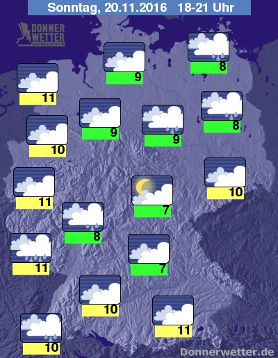 Heute Abend halten sich am Himmel meist dichte Wolken, die vor allem über dem Südwesten, dem Nordosten und im Umfeld der Nordsee gebietsweise Regenfälle bringen. In den anderen Landesteilen bleibt es hingegen weitgehend trocken, Auflockerungen bleiben hier aber selten. Die Abendtemperatur liegt bei 7 bis 11 Grad. Im Norden weht ein starker bis stürmischer Wind, auf den Bergen und an der Nordsee herrscht verbreitet Sturm.