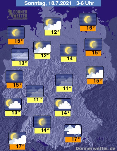 In der Nacht zum Sonntag bilden sich im Südosten und am Alpenrand unter dichten Wolken weitere Schauer. Über Sachsen ist es locker bis aufgelockert bewölkt und trocken. Im übrigen Bundesgebiet ist es verbreitet locker bewölkt oder sternenklar, dazu bleibt es ebenso trocken. Die Temperatur sinkt auf 17 Grad in Freiburg und bis 11 Grad in Erfurt.