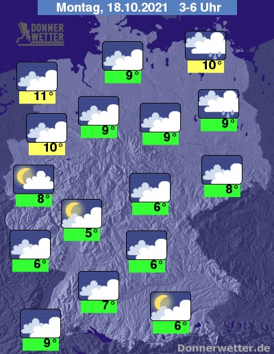 In der Nacht zum Montag ziehen vor allem im Norden und Osten kompakte Wolken durch, die hier auch gebietsweise Regen bringen können. Im übrigen Land ist es zumeist stark, hier und da aber auch aufgelockert bewölkt, dazu bleibt es trocken. Die Temperatur sinkt auf 11 Grad in Wilhelmshaven und bis 5 Grad in Wiesbaden.