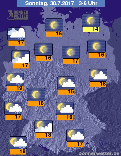 In der Nacht zum Sonntag ist es zunächst verbreitet nur locker bewölkt oder sternenklar. Im Laufe der zweiten Nachthälfte ziehen in den westlichen Landesteilen zunehmend dichte Wolken auf, die hier einzelne Schauer oder Gewitter mit sich bringen. Im übrigen Bundesgebiet bleibt es trocken bei Tiefstwerten zwischen 19 Grad in Köln und etwa 14 Grad auf Rügen.